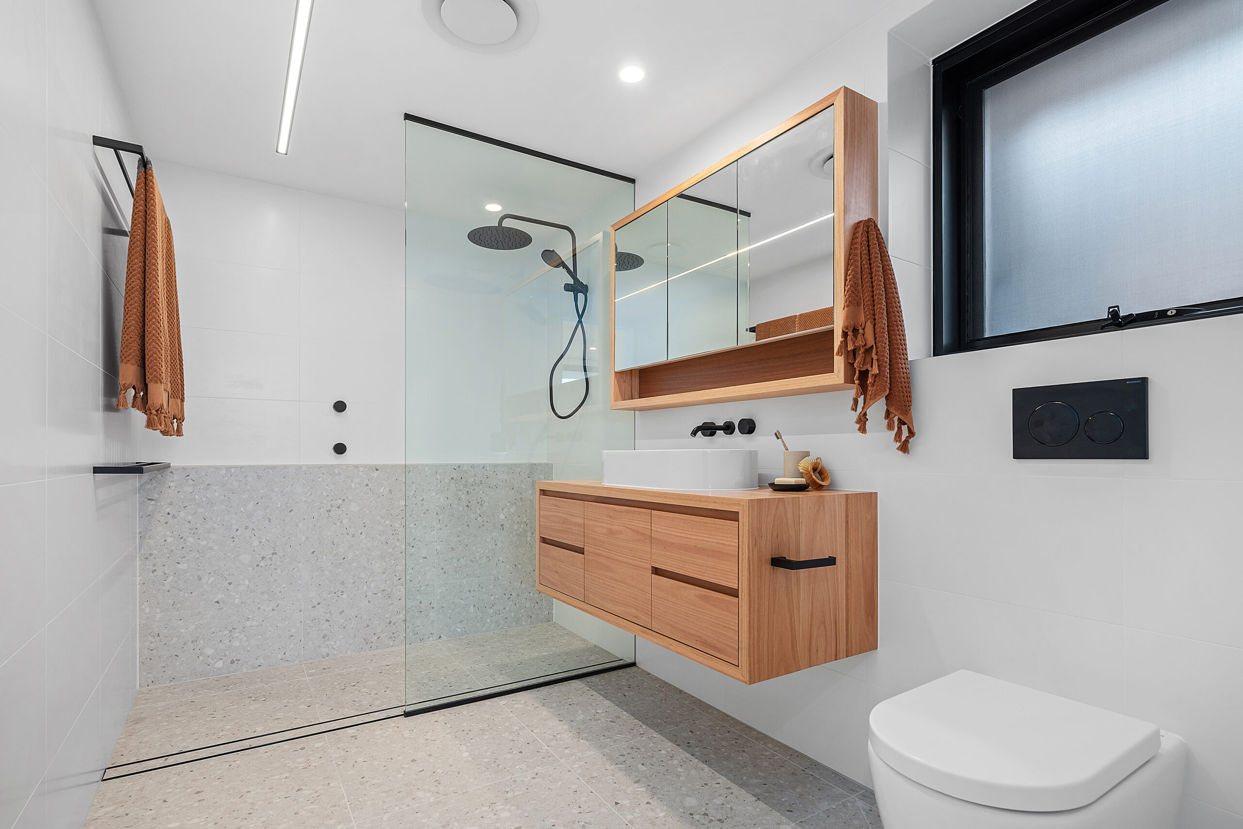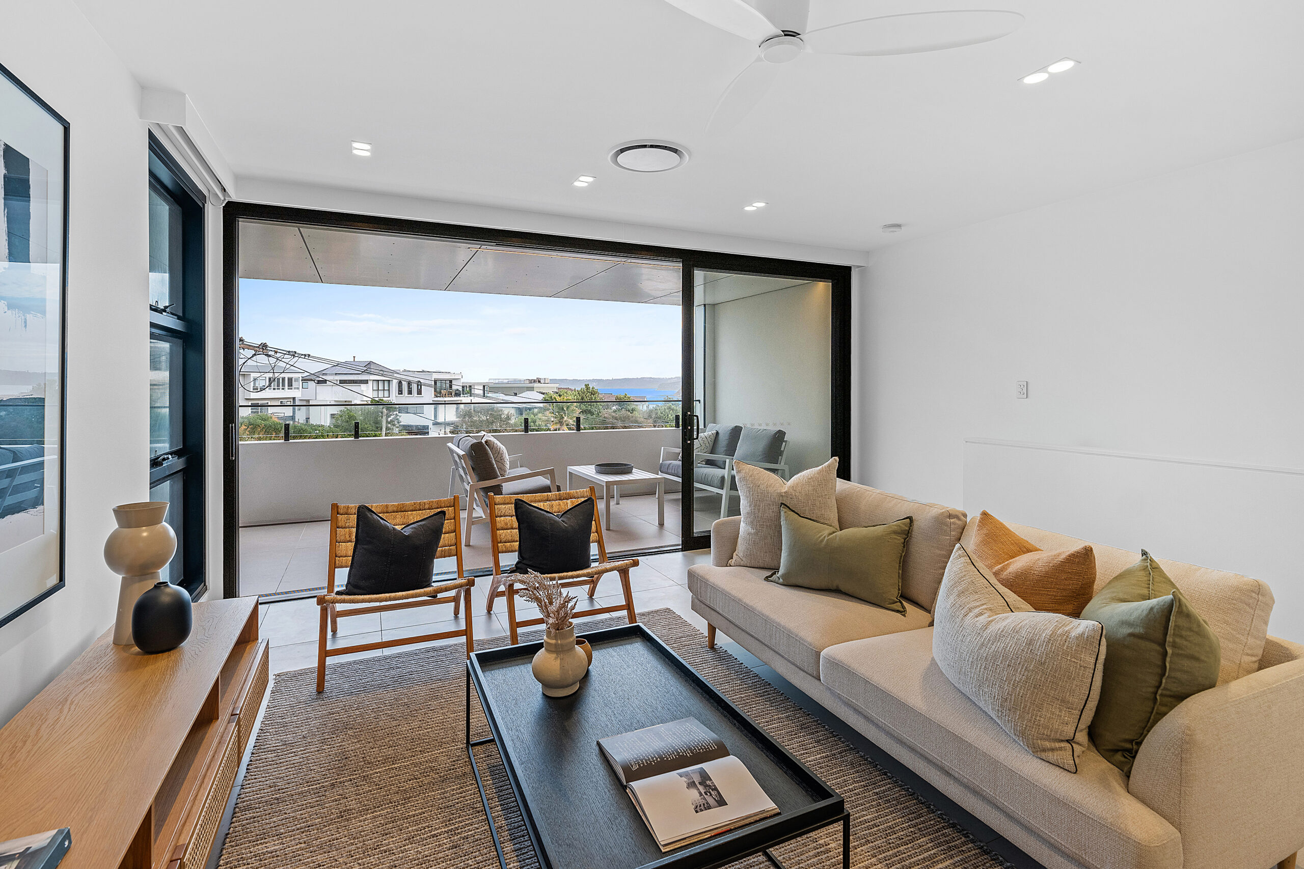 Each four-bedroom dwelling features open-plan living, dining, and kitchen areas oriented to capture northern sunlight and coastal breezes. Generous terraces at both the front and rear optimise outdoor living while maintaining privacy and view sharing with neighbouring properties. High-quality materials, including render, metal cladding, and honed blockwork, create a refined coastal palette that unifies the development.