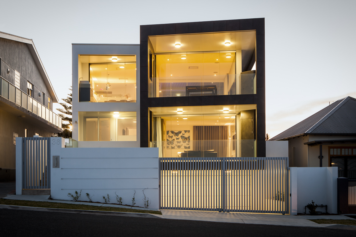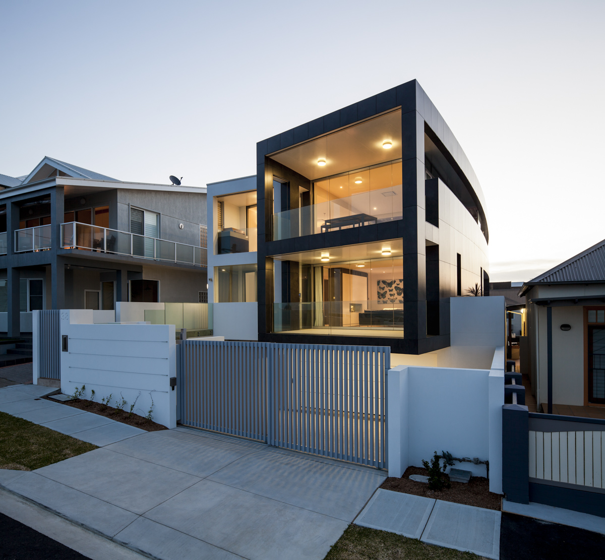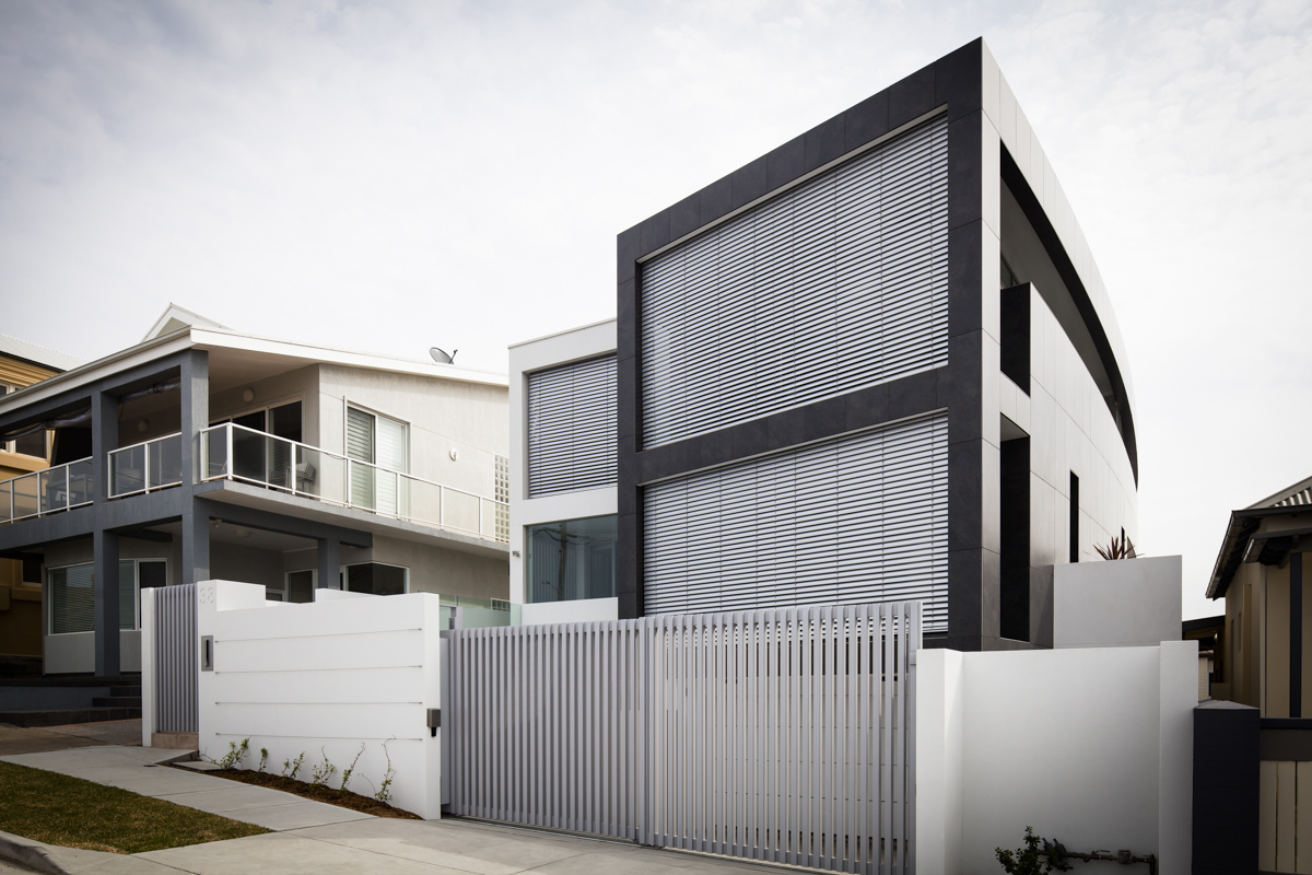 Overlooking Bar Beach with sweeping ocean and city views, this residence was designed to make a bold architectural statement while providing a flexible and enduring family home. The design combines two contrasting forms — a curved, dark-tiled volume and a solid white masonry structure — creating both visual drama and balance.