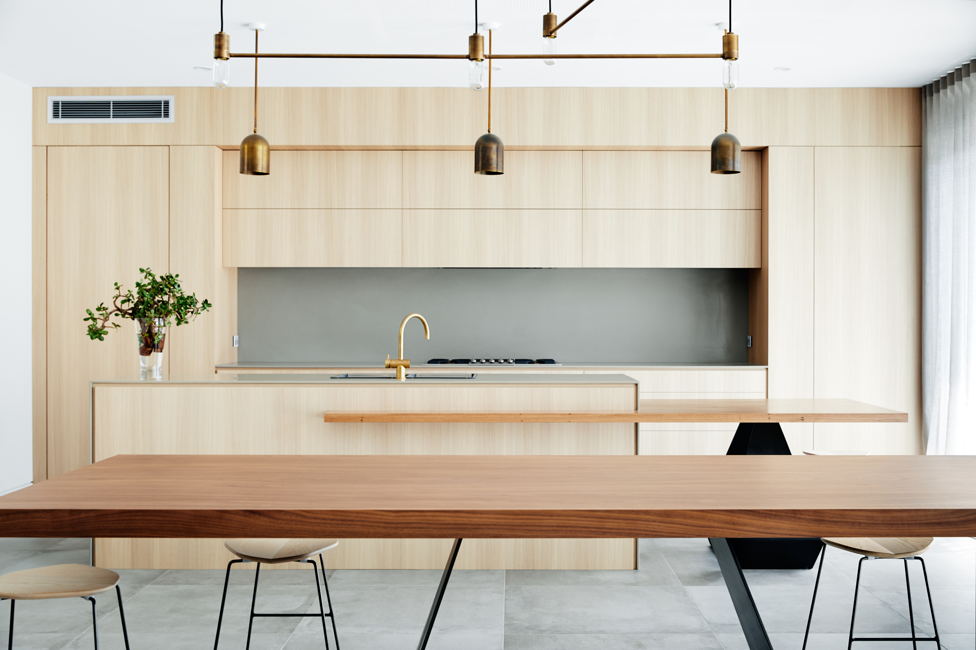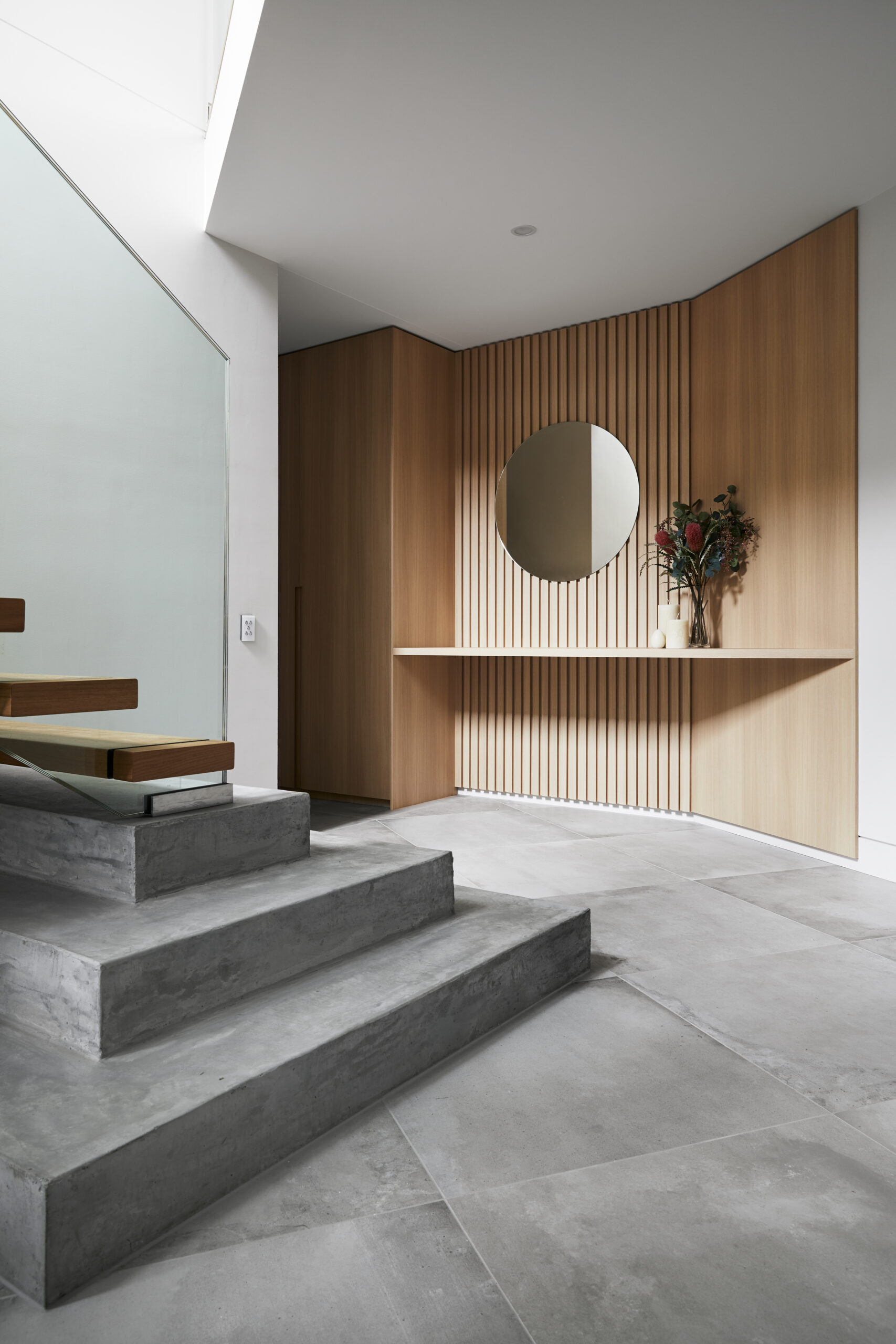 Two intersecting building forms are angled to follow the street alignment, defining a sheltered entry and framing a series of open-plan living spaces oriented north to maximise light and ventilation. The interior features a clean, modern palette — crisp white walls balanced by pale timbers, soft concrete tones and aged brass accents. Seamless tiling and refined detailing create a cohesive, low-maintenance interior ideal for family living. Externally, the façades are articulated through a mix of materials and deep eaves that provide texture, shade and solar control. Thoughtful orientation preserves neighbouring views and privacy while ensuring every living and bedroom space benefits from natural light. Sustainability measures include roof water collection for reuse, high-efficiency fittings, and natural cross-ventilation supported by insulated walls and roofing.