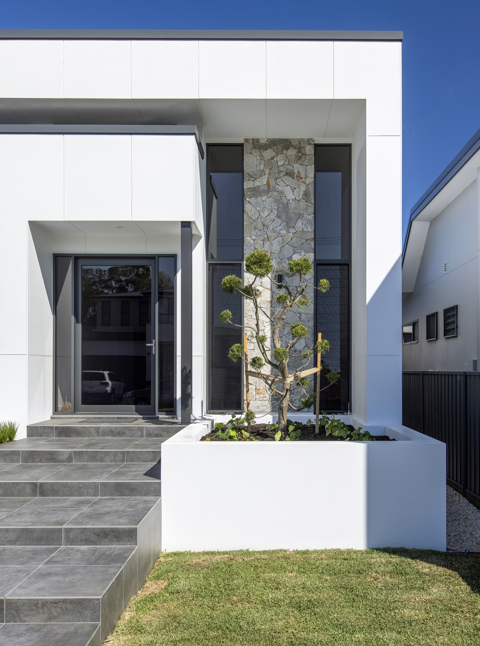 The design responds to the site’s orientation and proportions, creating a light-filled home that opens to the north and connects seamlessly to outdoor entertaining areas. Living spaces flow to a sheltered alfresco terrace and pool, while the protected courtyard draws sunlight deep into the interior.
