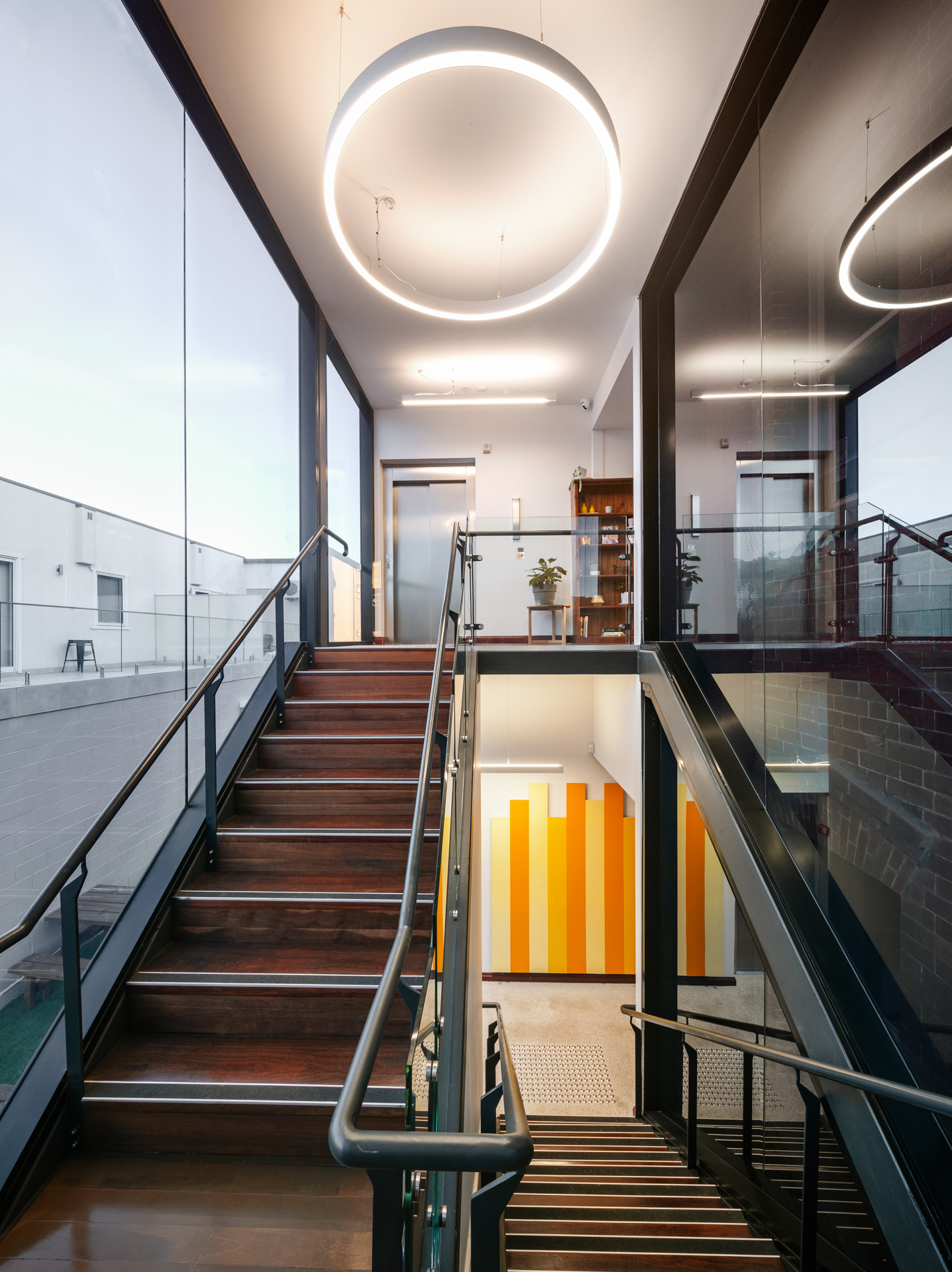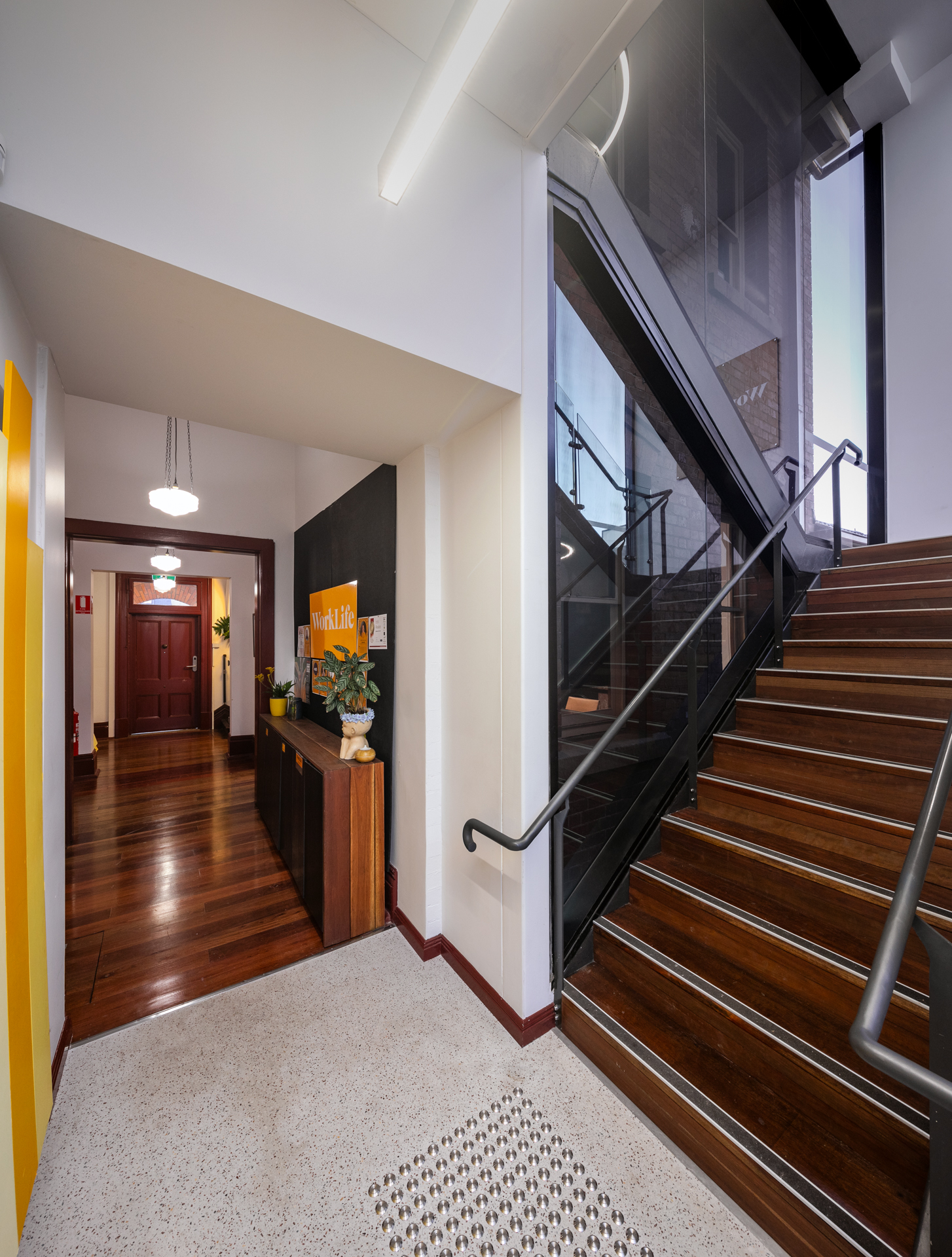 Flexible work zones were created using durable, low-maintenance finishes, while new lighting and climate systems provide comfort and energy efficiency within the building’s original masonry shell. A new circulation core with lift and stair delivers equitable access to all levels, ensuring inclusivity for every user.