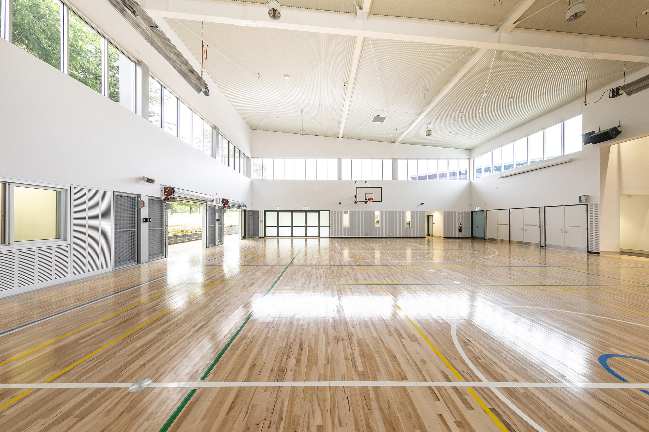 The former hall lacked an indoor sports court, limiting activities. Our design introduced a new communal space with a basketball court, stage, storerooms, amenities and a staff room. Through careful master planning, we selected a site that replaced the outdoor basketball court, adjacent to both the old hall and the new STEM building. The compact design responds to the topography, improves surveillance, and strengthens the school’s connection to Victoria Park.